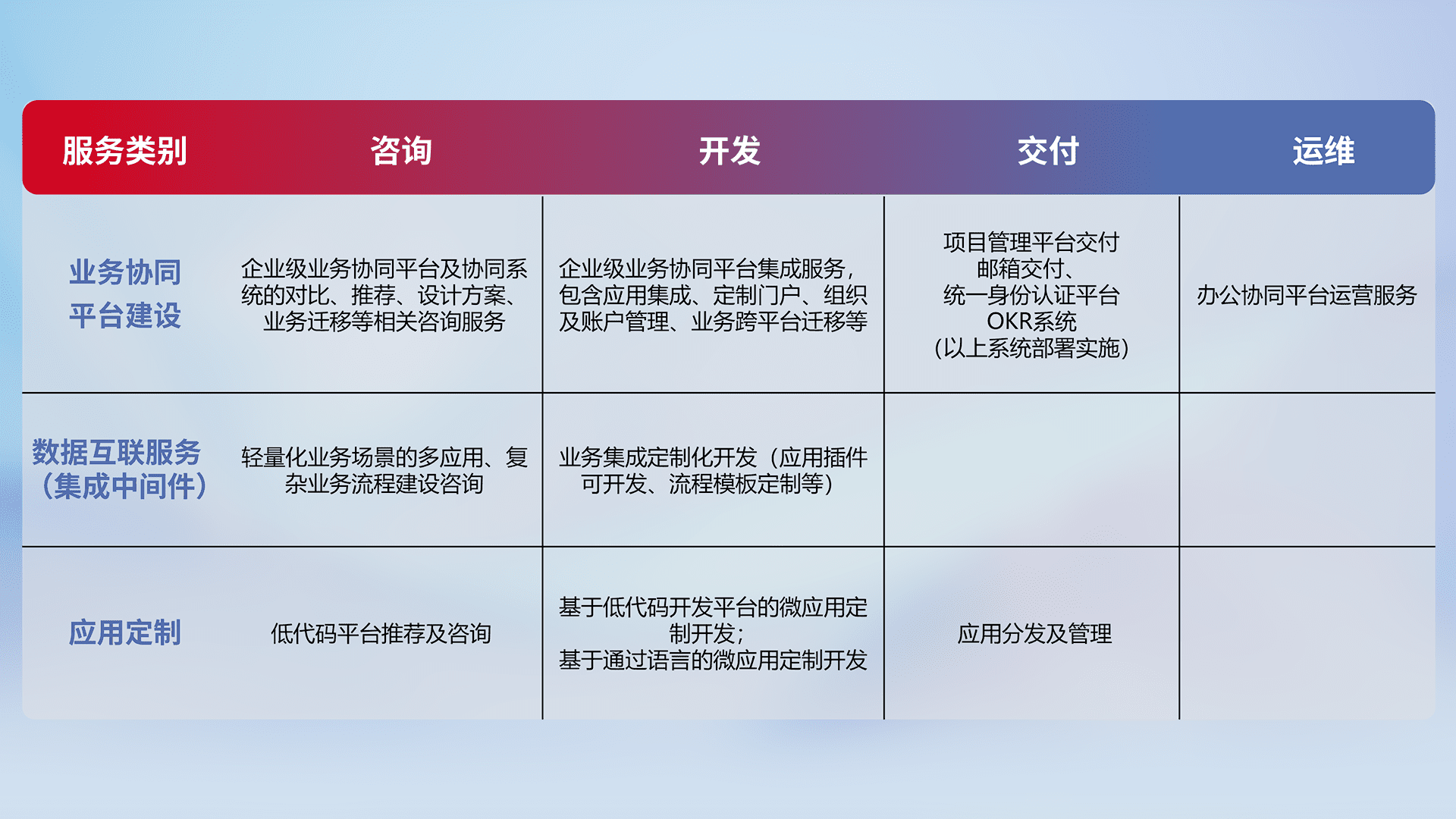 针对钉钉、、企微、、IDaas等平台级产品提供产品的规划、、、方案、、、、交付、、定制化开发等服务,,实现如统一协同办公、、智能客户服务、、混合会议管理、、、、智能数据查询、、等业务场景,,,,实现数字化转型。。。